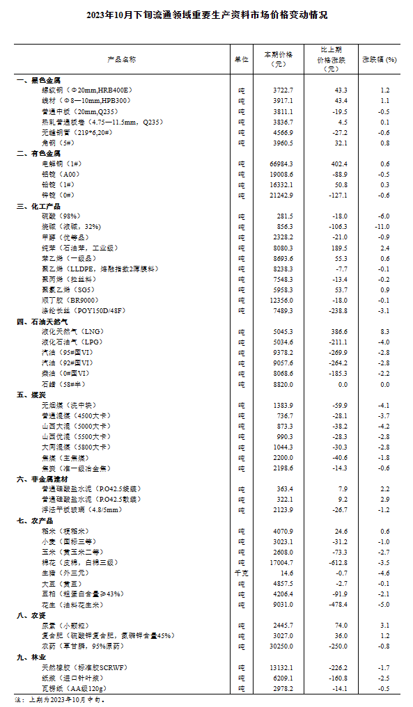 2023年10月下旬流通領(lǐng)域重要生產(chǎn)資料市場價格變動情況