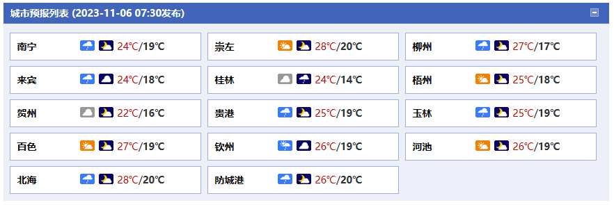 南寧市:今天白天陰天有小雨、局地中雨,今天晚上陰天到多云,東北風(fēng)3~4級(jí)、陣風(fēng)6~7級(jí),最高氣溫24℃,最低氣溫19℃。