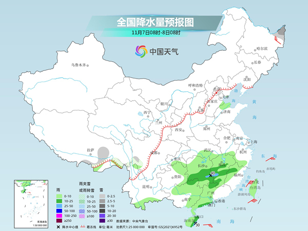 昨天,受今冬首輪寒潮影響,內(nèi)蒙古東部和東北部分地區(qū)出現(xiàn)強(qiáng)降雪。監(jiān)測顯示,內(nèi)蒙古東南部、遼寧中西部降水量10~25毫米、局地超過30毫米,部分地區(qū)最大積雪深度1~8厘米,局地超過14厘米。與此同時(shí),冷空氣南下過程中還給南方帶來強(qiáng)對流天氣,廣西北部、海南島東北部、湖南南部、江西北部、浙江西北部等地部分地區(qū)出現(xiàn)大雨或暴雨,廣西河池局地大暴雨。