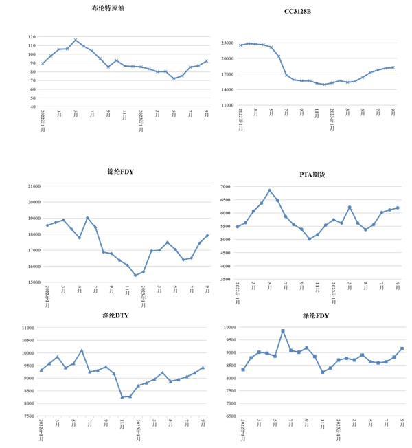 圖1 2022年1月~2023年9月我國化纖長絲、棉花、PTA期貨及布倫特原油價(jià)格走勢