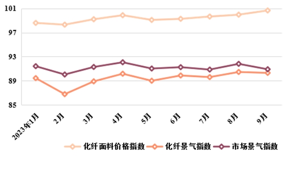 圖2 2023年1~9月我國市場景氣、化纖景氣和化纖面料價(jià)格指數(shù)走勢