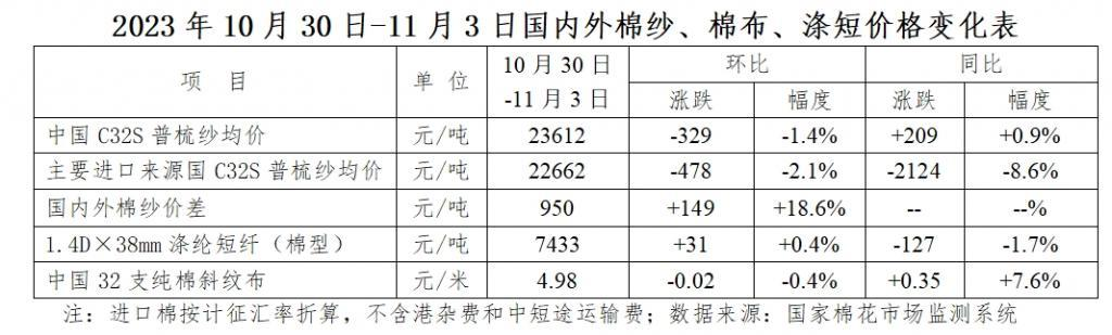 本周(2023年10月30日-11月3日),國內(nèi)外棉花價(jià)格大跌后有所反彈;內(nèi)外棉紗價(jià)格共振下跌;國內(nèi)滌綸短纖價(jià)格震蕩運(yùn)行。