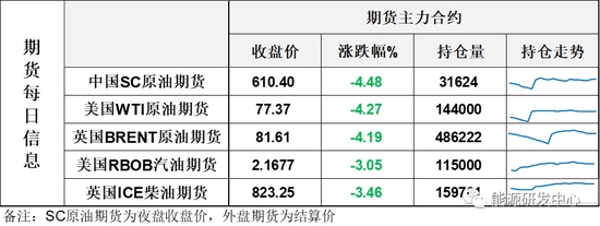 【1】WTI主力原油期貨收跌3.45美元,跌幅4.27%,報(bào)77.37美元/桶;布倫特主力原油期貨收跌3.57美元,跌幅4.19%,報(bào)81.61美元/桶;INE原油期貨收跌4.48%,報(bào)610.4元。