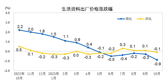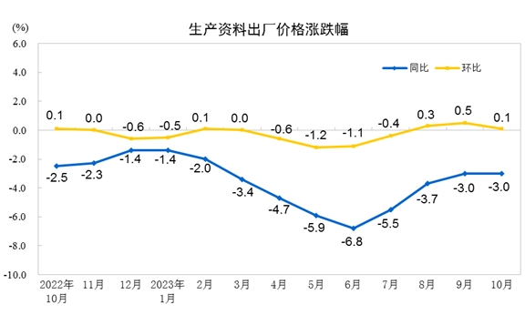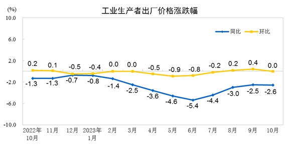 2023年10月份,全國工業(yè)生產(chǎn)者出廠價格同比下降2.6%,環(huán)比持平;工業(yè)生產(chǎn)者購進價格同比下降3.7%,環(huán)比上漲0.2%。1—10月平均,工業(yè)生產(chǎn)者出廠價格比上年同期下降3.1%,工業(yè)生產(chǎn)者購進價格下降3.6%。