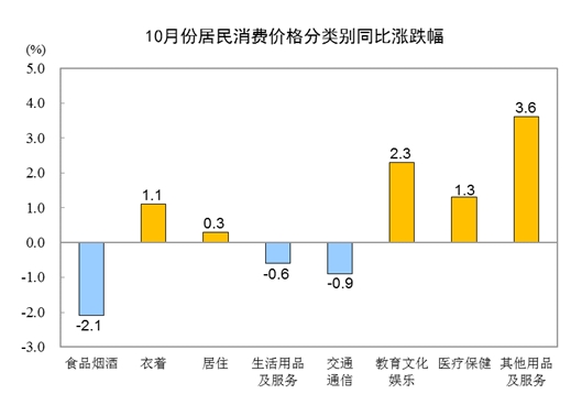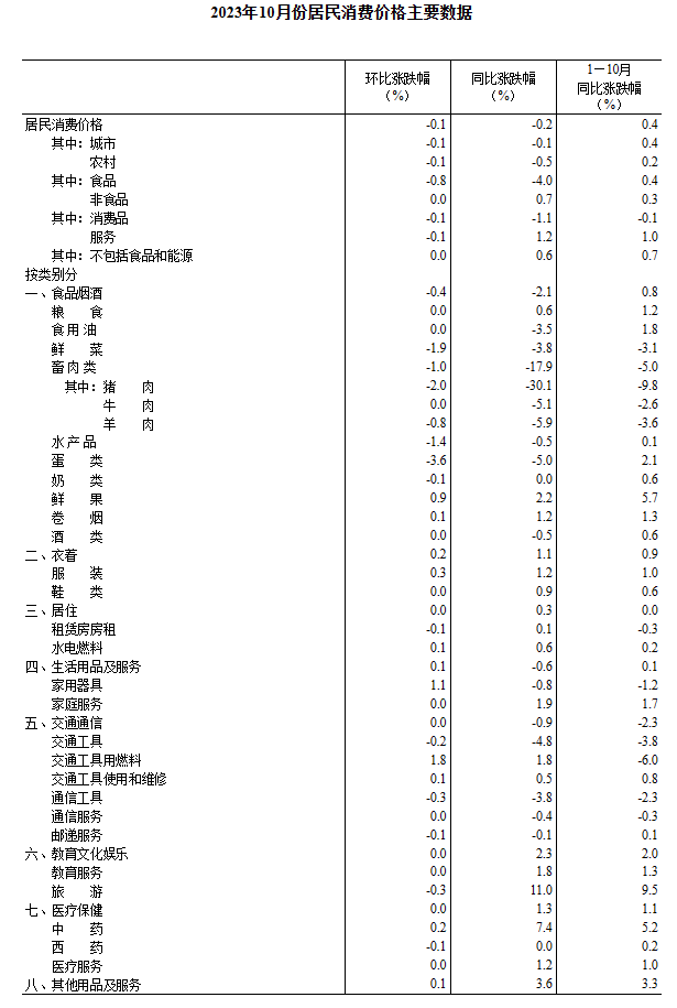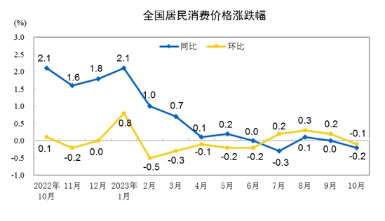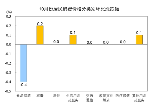 10月份,全國居民消費價格環(huán)比下降0.1%。其中,城市下降0.1%,農村下降0.1%;食品價格下降0.8%,非食品價格持平;消費品價格下降0.1%,服務價格下降0.1%。