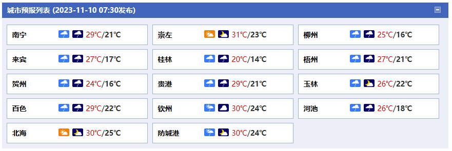 南寧市:今天白天到晚上,多云到陰天、有小雨,東南風(fēng)轉(zhuǎn)東北風(fēng)2級,最高氣溫29℃,最低氣溫21℃。
