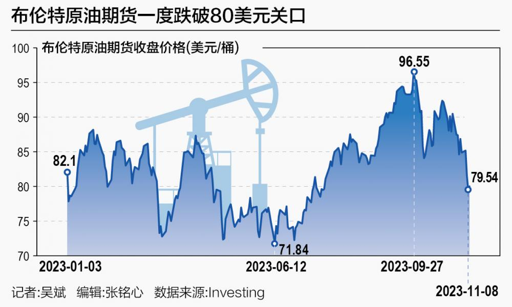上周布倫特原油價格自7月以來首次跌破每桶80美元大關(guān)。11月10日,布倫特原油期貨徘徊在80美元/桶附近,WTI原油期貨在76美元/桶附近。