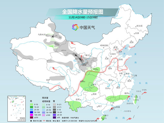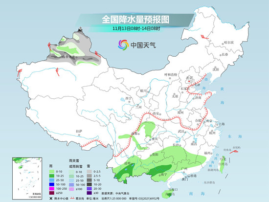 具體來看,今天,新疆北部等地部分地區(qū)有小雪或雨夾雪,局地有中到大雪。西南地區(qū)南部、江南南部、華南大部等地部分地區(qū)有小到中雨,局地有大雨。
