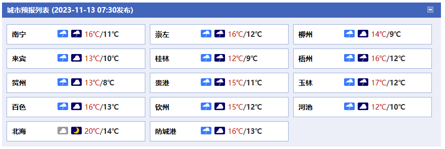 南寧市:今天白天到晚上,陰天有小雨,東北風3~4級,最高氣溫16℃,最低氣溫11℃。