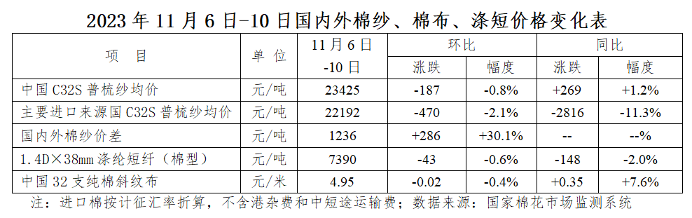本周(2023年11月6日-10日),國內(nèi)棉花價格區(qū)間波動,國際棉花價格連續(xù)大跌后小幅反彈;國內(nèi)棉紗價格由跌轉(zhuǎn)穩(wěn),國際棉紗價格繼續(xù)下跌;國內(nèi)滌綸短纖價格震蕩運(yùn)行。
