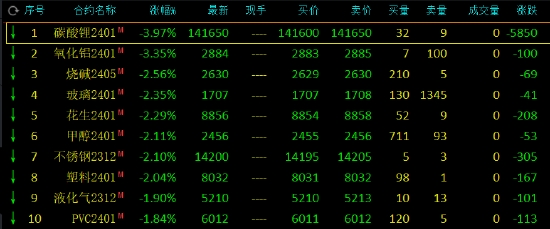 午盤收盤,國內(nèi)期貨主力合約跌多漲少,碳酸鋰跌近4%,氧化鋁跌超3%,燒堿、玻璃(1670, -61.00, -3.52%)、花生、甲醇(2474, 6.00, 0.24%)、不銹鋼(SS)、塑料(8063, -37.00, -0.46%)跌超2%。漲幅方面,滬錫(213670, 1500.00, 0.71%)漲超2%,菜油、鐵礦(964, 1.00, 0.10%)、焦煤(1994, -37.00, -1.82%)、紙漿、低硫燃料油(LU)漲超1%。