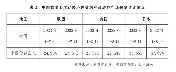 從市場(chǎng)份額來(lái)看,今年以來(lái),主要發(fā)達(dá)經(jīng)濟(jì)體如美國(guó)、歐盟等對(duì)針織產(chǎn)品的進(jìn)口需求均有所下降,同時(shí)我國(guó)產(chǎn)品在上述市場(chǎng)中的份額占比也有所減少。1~7月歐盟針織產(chǎn)品進(jìn)口額同比下降12.55%,其中對(duì)我國(guó)進(jìn)口同比下降14.89%;1~8月美國(guó)針織產(chǎn)品進(jìn)口額同比下降27.71%, 其中對(duì)我國(guó)進(jìn)口同比下降32.93%;1~8月日本針織產(chǎn)品進(jìn)口額同比增長(zhǎng)1.52%,其中對(duì)我國(guó)進(jìn)口同比下降4.15%。