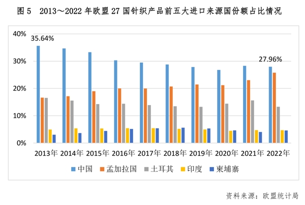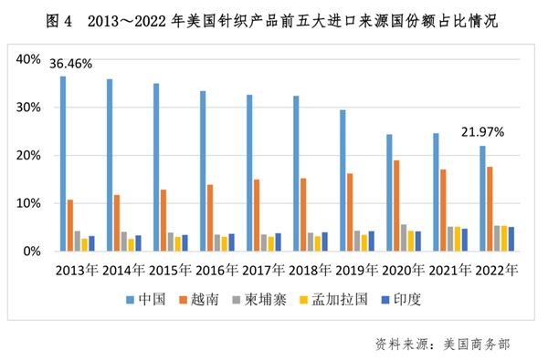 目前,美國(guó)針織產(chǎn)品進(jìn)口前五大來(lái)源國(guó)分別為中國(guó)、越南、柬埔寨、孟加拉、印度。從近10年數(shù)據(jù)看,中國(guó)在美國(guó)的市場(chǎng)份額大幅下降,降低了近15個(gè)百分點(diǎn);與此同時(shí),越南占比有較大幅度提升,十年間提高了近7個(gè)百分點(diǎn),進(jìn)一步縮小與中國(guó)之間的差距。