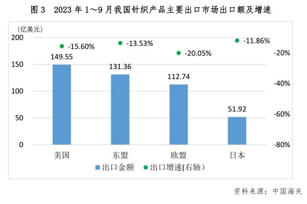 從主要出口市場(chǎng)來(lái)看,我國(guó)針織產(chǎn)品對(duì)幾大出口目的國(guó)的出口額依舊保持收縮態(tài)勢(shì),降幅與上半年基本持平。