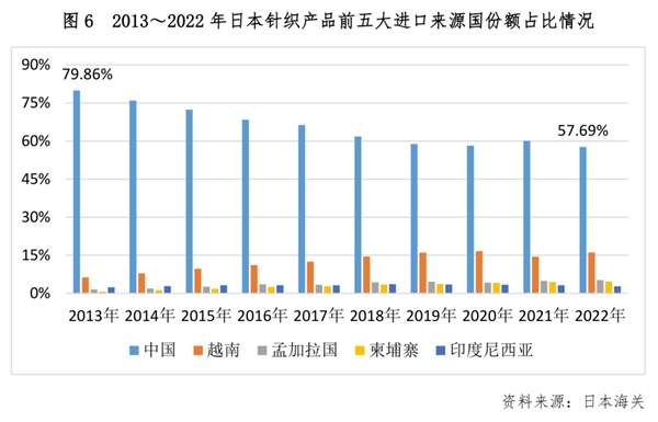歐盟地區(qū),中國(guó)、孟加拉位居其針織產(chǎn)品進(jìn)口的前兩位,二者占比之和超過(guò)50%。隨著近十年的發(fā)展,孟加拉國(guó)的份額直逼中國(guó),中孟兩國(guó)的占比差額從領(lǐng)先19%到不足3%。另外,受轉(zhuǎn)口貿(mào)易因素影響,未來(lái)我國(guó)向日本出口或面臨越南等國(guó)的擠壓,值得重視和關(guān)注。