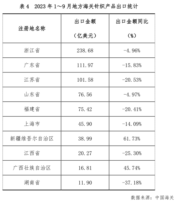 從地方海關(guān)數(shù)據(jù)來(lái)看,1~9月浙江、廣東、福建、江蘇和山東五個(gè)紡織大省的出口額較上年同期均有所下降,其中江蘇省和福建省的出口降幅較為明顯,同比分別下降了20.53%和20.41%。