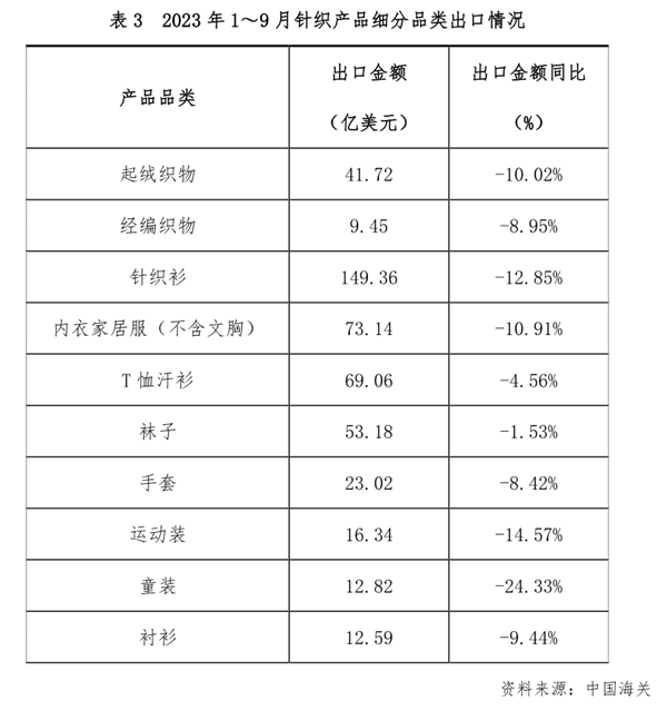 從細(xì)分品類來(lái)看,1~9月大多數(shù)產(chǎn)品出口額同比均有所下滑,其中針織童裝、運(yùn)動(dòng)服、針織衫的降幅較為明顯,同比分別下降24.33%、14.57%和12.85%。