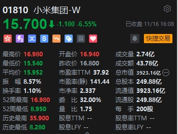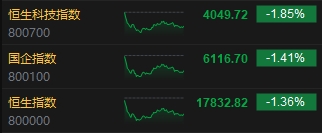 11月16日消息,港股三大指數(shù)高開低走,截至收盤,恒生指數(shù)(17832.818, -246.18, -1.36%)跌1.36%,報(bào)17832.82點(diǎn),恒生科技指數(shù)(4049.72, -76.15, -1.85%)跌1.85%,國企指數(shù)跌1.41%。盤面上,核心科技股漲跌不一,小米集團(tuán)跌超6%,網(wǎng)易、阿里巴巴跌超2%,快手漲3%,京東集團(tuán)績后漲近2%;汽車股部分上漲,華晨中國漲超5%;醫(yī)藥外包概念股跌幅居前,藥明生物(47.75, -2.95, -5.82%)跌近6%;生物技術(shù)板塊多數(shù)下挫,亞盛生物跌超7%,康寧杰瑞制藥回彈漲近6%;體育用品股下跌,李寧(23.6, -1.25, -5.03%)跌超5%;煤炭股漲幅居前,龍頭中國神華(25.2, 0.35, 1.41%)漲超1%;半導(dǎo)體、互聯(lián)網(wǎng)醫(yī)療、電子零件、SaaS等板塊跌幅明顯。