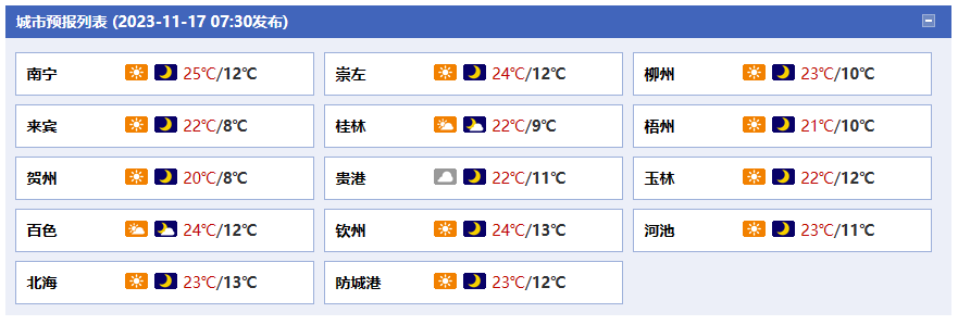 南寧市:今天,晴間多云,東北風(fēng)3~4級(jí)、陣風(fēng)6~7級(jí),最低溫度13℃,最高溫度24℃。