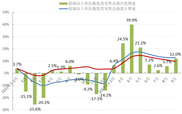 前三季度,在國家促消費系列政策持續(xù)發(fā)力顯效、消費場景全面恢復(fù)、居民收入及消費信心逐步回升等積極因素影響下,國內(nèi)服裝銷售市場保持良好恢復(fù)態(tài)勢,市場活力持續(xù)回升,消費需求逐漸釋放。根據(jù)國家統(tǒng)計局數(shù)據(jù),1-9月,我國社會消費品零售總額342107億元,同比增長6.8%,增速比1-6月放緩1.4個百分點。其中,限額以上單位服裝類商品零售額累計7257億元,同比增長12.8%,增速比1-6月放緩2.7個百分點。三季度限額以上單位服裝類商品零售額月度增速持續(xù)回升,7月同比增長2.6%,8月同比增長5.7%,9月同比增長12%(見圖2)。線上服裝零售增速小幅放緩,1-9月,穿類商品網(wǎng)上零售額同比增長9.6%,增速比1-6月放緩3.7個百分點。