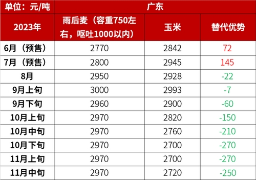與糙米不同,目前南方地區(qū)芽麥替代飼料玉米的情況基本銷聲匿跡,更多品質(zhì)相對較好的芽麥開始流向面粉加工領(lǐng)域。從下表可見,由于近期國內(nèi)小麥價(jià)格相對抗跌,南方雨后麥價(jià)格跌幅并不明顯,但其較之飼用玉米的比價(jià)優(yōu)勢已蕩然無存,參見下圖。
