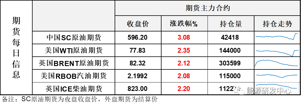 【1】WTI主力原油期貨收漲1.79美元,漲幅2.35%,報(bào)77.83美元/桶;布倫特主力原油期貨收漲1.71美元,漲幅2.12%,報(bào)82.32美元/桶;INE原油期貨收漲3.08%,報(bào)596.2元。