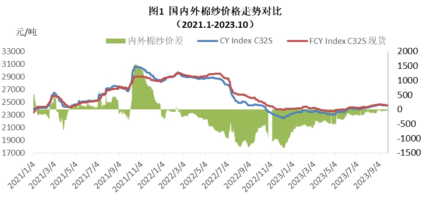 本月內(nèi)外棉紗價格均下跌,國產(chǎn)32支純棉紗10月均價為24122元/噸,較上月下跌402元,跌幅1.64%,較去年同期上漲94元,漲幅0.39%;進(jìn)口32支純棉紗10月均價24312元/噸,較上月下跌了258元,跌幅1.06%,較去年同期下降了411元,跌幅1.66%。