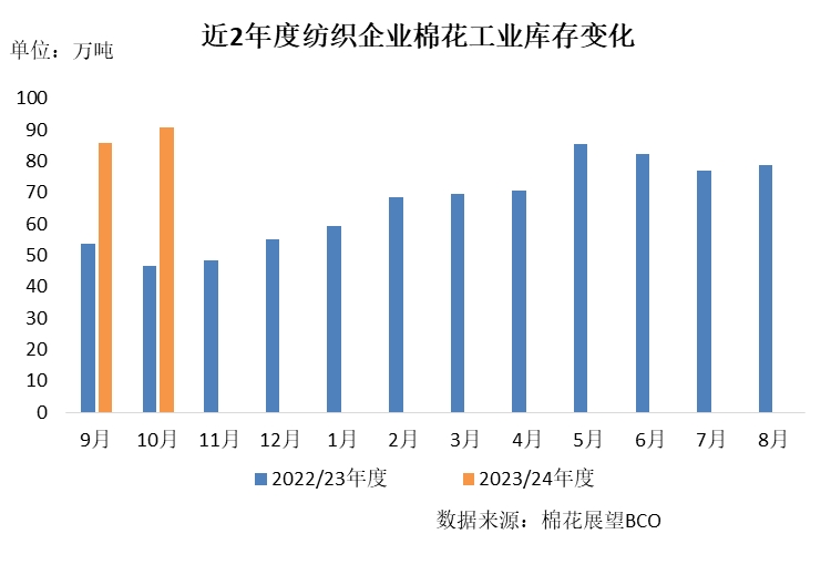 紡織企業(yè)新增訂單不佳,原料采購偏謹(jǐn)慎,但由于儲備棉持續(xù)輪出,企業(yè)競拍仍相對積極,月內(nèi)原料庫存有所增加。截至10月30日,紡織企業(yè)在庫棉花工業(yè)庫存量為90.7萬噸,環(huán)比增加4.99萬噸,同比增加44.19萬噸。其中:21%的企業(yè)減少棉花庫存,38%增加庫存,41%基本保持不變。