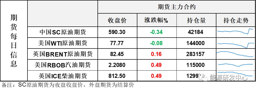 【1】WTI主力原油期貨收跌0.06美元,跌幅0.08%,報77.77美元/桶;布倫特主力原油期貨收漲0.13美元,漲幅0.16%,報82.45美元/桶;INE原油期貨收跌0.34%,報590.3元。