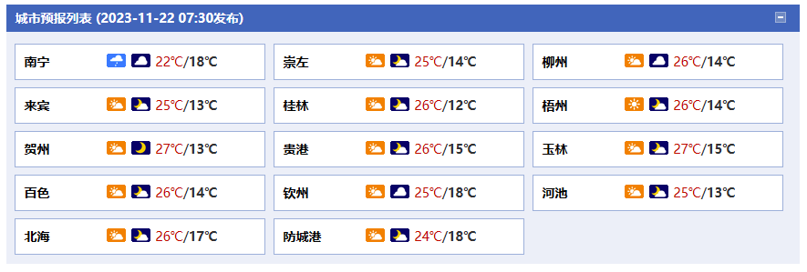 南寧市:今天白天多云轉(zhuǎn)陰天有小雨,今天晚上陰天到多云,偏東風轉(zhuǎn)東北風1~2級,最高氣溫22℃,最低氣溫18℃。