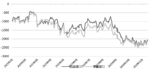 從榨季初期的交易節(jié)奏來(lái)看,需要考慮國(guó)產(chǎn)糖的上市時(shí)間。前期累積的含糖量需要10℃以上的溫差才有利于含糖量的提升,在庫(kù)存低位的情況下,提前開(kāi)榨成為糖廠共同的選擇。不過(guò),廣西10月溫差不明顯,導(dǎo)致計(jì)劃提前開(kāi)榨的糖廠在測(cè)量含糖量時(shí)發(fā)現(xiàn)不足以支撐開(kāi)榨。即使11月初開(kāi)始陸續(xù)有糖廠點(diǎn)火烘爐進(jìn)行開(kāi)榨準(zhǔn)備儀式,但在11月7日廣西制糖企業(yè)共同簽署了制糖行業(yè)自律公約,統(tǒng)一約定糖廠開(kāi)機(jī)時(shí)間不早于12月1日,如需提前開(kāi)機(jī),需在開(kāi)機(jī)前7天完成申請(qǐng)。筆者根據(jù)調(diào)研了解,有7—8家糖廠申請(qǐng)?zhí)崆霸?1月20日左右開(kāi)機(jī),大多數(shù)糖廠將在12月初開(kāi)機(jī)。截至11月24日,有10家左右的廣西糖廠開(kāi)始?jí)赫?。因此,從?guó)產(chǎn)糖的供應(yīng)時(shí)間來(lái)看,首批國(guó)產(chǎn)糖供應(yīng)時(shí)間將比市場(chǎng)預(yù)期推后半個(gè)月至一個(gè)月。鄭糖近月合約供應(yīng)出現(xiàn)階段性緊張,中間貿(mào)易商補(bǔ)庫(kù)出現(xiàn)困難,近月合約價(jià)格較遠(yuǎn)月合約更堅(jiān)挺。截至11月23日,鄭糖期貨2401和2405合約價(jià)差由11月初30—40元/噸走擴(kuò)至70—80元/噸。
