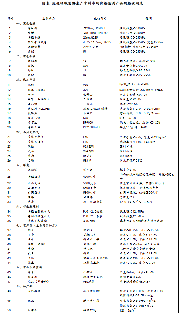 流通領(lǐng)域重要生產(chǎn)資料市場(chǎng)價(jià)格監(jiān)測(cè)內(nèi)容包括9大類50種產(chǎn)品的價(jià)格。類別與產(chǎn)品規(guī)格說明詳見附表。