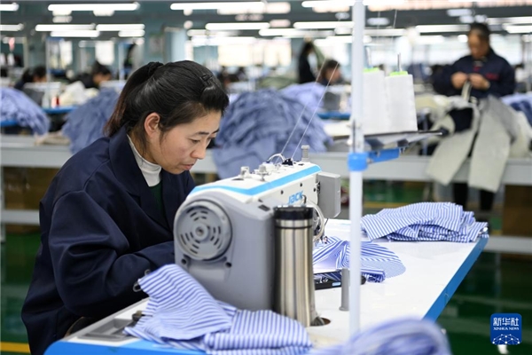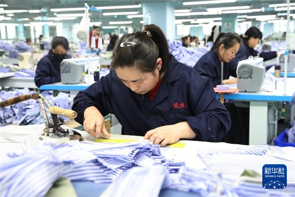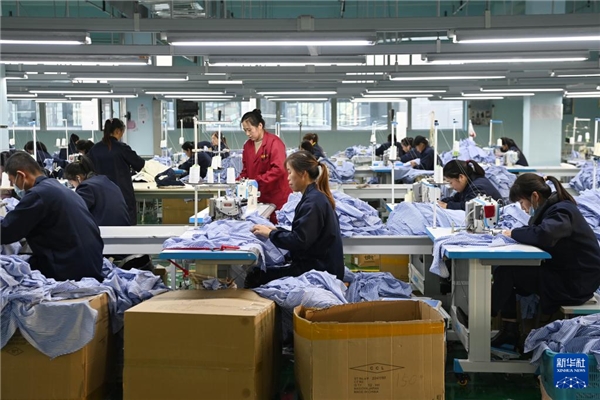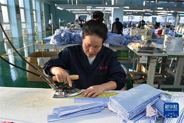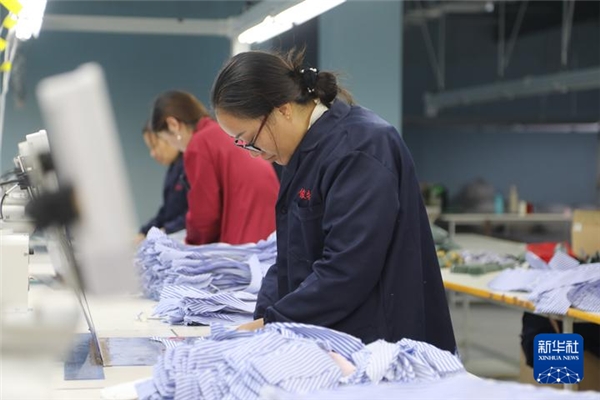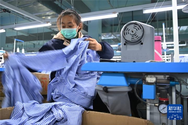11月23日,工作人員在膠州·通渭服裝產(chǎn)業(yè)園的一家服裝企業(yè)生產(chǎn)車間工作。新華社記者 馬莎 攝