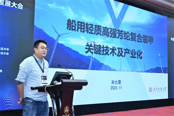 武漢紡織大學(xué)復(fù)合材料與工程系主任、副教授孫九霄作“船用輕質(zhì)高強芳綸復(fù)合裝甲關(guān)鍵技術(shù)及產(chǎn)業(yè)化”主題報告,他從研究背景與總體思路、研究內(nèi)容及相關(guān)技術(shù)、主要技術(shù)經(jīng)濟指標(biāo)及與國外對比、知識產(chǎn)權(quán)及第三方評價、應(yīng)用推廣和經(jīng)濟社會效益情況等方面展開,詳細介紹了預(yù)活化芳綸纖維與高韌性熱塑性樹脂制備技術(shù)、織物結(jié)構(gòu)設(shè)計與復(fù)合裝甲防護性能研究、芳綸復(fù)合裝甲自動化設(shè)備研制等內(nèi)容。
