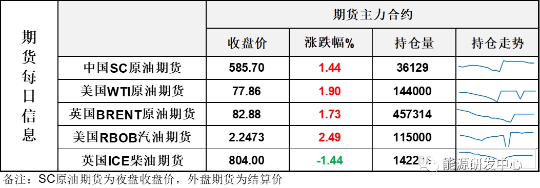 【1】WTI主力原油期貨收漲1.45美元,漲幅1.9%,報77.86美元/桶;布倫特主力原油期貨收漲1.41美元,漲幅1.73%,報82.88美元/桶;INE原油期貨收漲1.44%,報585.7元。