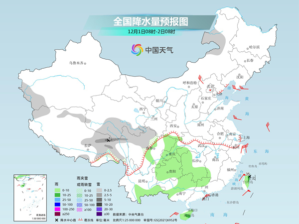 未來(lái)三天,我國(guó)雨雪總體不多,且強(qiáng)度較弱,以小雨雪為主。西藏、青海南部等地將會(huì)有小雪,西南地區(qū)東部、華南多陰雨天氣。