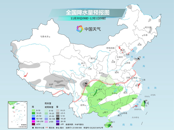 具體來(lái)看,今天山東半島、黑龍江東部和中部、新疆南疆西部山區(qū)、西藏北部和東部、青海南部、川西高原北部、陜西南部、湖北西北部等地部分地區(qū)有小到中雪或雨夾雪,其中,山東半島、川西高原北部等地部分地區(qū)有大到暴雪。四川盆地、湖南北部和南部、江西南部、福建中西部、湖北南部、貴州大部、云南東部、廣西、廣東北部、海南島、臺(tái)灣島中北部等地部分地區(qū)有小到中雨,其中,海南島東部、臺(tái)灣島北部局地有大雨。