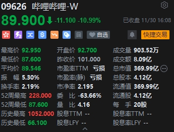 第三季度業(yè)績遜預(yù)期,嗶哩嗶哩跌近11% ,報89.9港元,創(chuàng)2022年12月以來新低;隔夜美股嗶哩嗶哩收跌11.09%報11.86美元,折算成港股市場價格為94.37港元/股。消息面上,據(jù)嗶哩嗶哩港交所公告,2023年第三季度凈營業(yè)額總額為人民幣58億元,與2022年同期持平;凈虧損為人民幣13億元,較2022年同期收窄22%;經(jīng)調(diào)整凈虧損為人民幣8.6億元,較2022年同期收窄51%;日均活躍用戶(日活用戶)達1.03億,較2022年同期增加14%。
