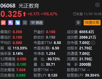光正教育績后飆漲超116.67%,報0.325港元。消息面上,光正教育發(fā)布年度業(yè)績,全年收入3.19億元人民幣,同比增長15.0%;凈利潤1.63億元,同比增長71.5%。學(xué)校相關(guān)供應(yīng)鏈于本年度仍然為最大的收入來源,該業(yè)務(wù)總收入由2022財年的人民幣1.544億元增加25.4%至2023財年的人民幣1.936億元。