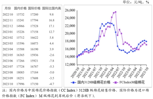 (一)國(guó)內(nèi)棉價(jià)止?jié)q轉(zhuǎn)跌。本月,新疆棉花大規(guī)模采收,加之儲(chǔ)備棉持續(xù)銷(xiāo)售,進(jìn)口棉不斷到港,棉花供給階段性充裕;下游紡織市場(chǎng)復(fù)蘇程度有限,紡企新增訂單量不足,需求相對(duì)疲軟。新棉銷(xiāo)售壓力增大,棉花價(jià)格小幅下跌,銷(xiāo)售14進(jìn)度較往年偏慢。據(jù)國(guó)家棉花市場(chǎng)監(jiān)測(cè)系統(tǒng)數(shù)據(jù),截至10月26日,全國(guó)新棉采摘進(jìn)度67.5%,同比下降6.0個(gè)百分點(diǎn);全國(guó)交售率55.2%,同比下降2.7個(gè)百分點(diǎn)。據(jù)《中國(guó)棉花工業(yè)庫(kù)存調(diào)查報(bào)告》數(shù)據(jù),10月初全國(guó)棉花工業(yè)庫(kù)存63.5萬(wàn)噸,環(huán)比增6.4%,同比增12%。采購(gòu)意向調(diào)查顯示,10月初準(zhǔn)備采購(gòu)棉花的企業(yè)占56.1%,環(huán)比增1.5個(gè)百分點(diǎn),同比減3.0個(gè)百分點(diǎn),比近五年同期平均水平減少0.8個(gè)百分點(diǎn)。10月份,國(guó)內(nèi)3128B級(jí)棉花月均價(jià)每噸17996元,環(huán)比跌1.4%,同比漲14.4%。鄭棉期貨主力合約(CF 401)月結(jié)算價(jià)每噸16095元,環(huán)比跌6.3%,同比漲19.7%。