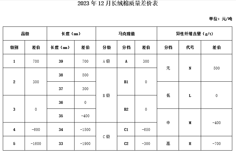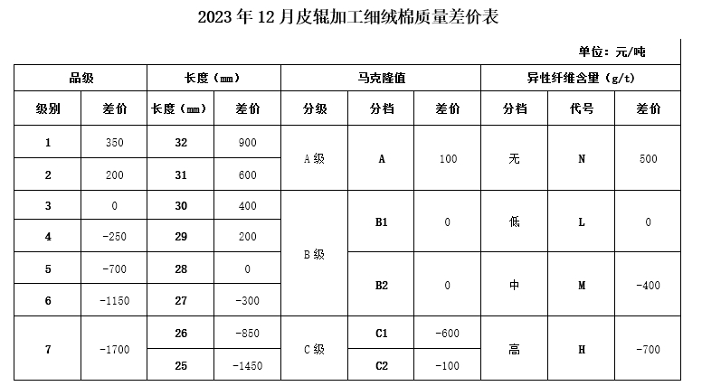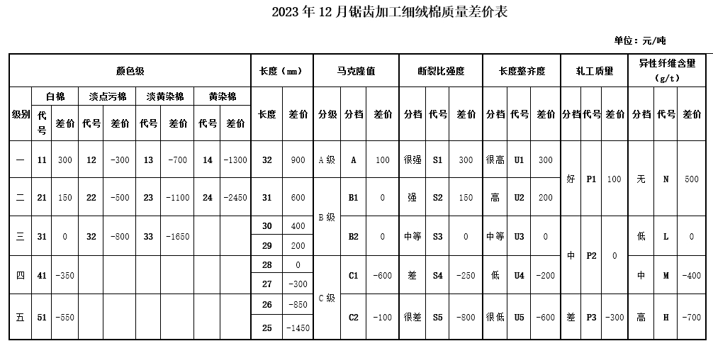 根據(jù)《中國棉花協(xié)會國產(chǎn)棉質(zhì)量差價表管理辦法》規(guī)定,現(xiàn)正式發(fā)布2023年12月《鋸齒加工細絨棉質(zhì)量差價表》、《皮輥加工細絨棉質(zhì)量差價表》和《長絨棉質(zhì)量差價表》(單位:元/噸)。