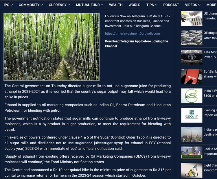 印度國(guó)內(nèi)的媒體也報(bào)道了政府禁止將甘蔗汁或糖漿用于生產(chǎn)乙醇: