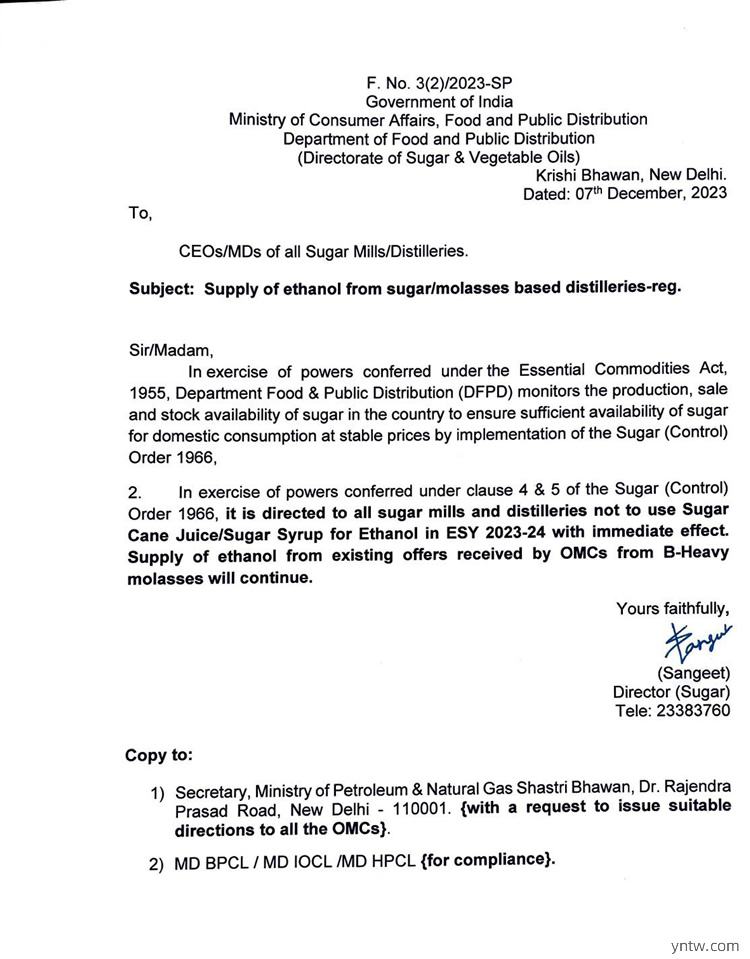 該政府文件主要意思是:為確保印度國(guó)內(nèi)市場(chǎng)有足夠的食糖供應(yīng)以及穩(wěn)定其國(guó)內(nèi)糖價(jià),指示糖廠在2023/24榨季年度不要使用甘蔗汁或糖漿生產(chǎn)乙醇,該政府文件立即生效。