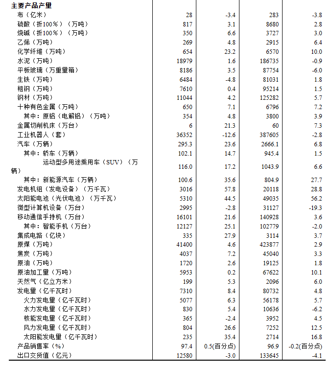 分產(chǎn)品看,11月份,620種產(chǎn)品中有367種產(chǎn)品產(chǎn)量同比增長。其中,鋼材11044萬噸,同比增長4.2%;水泥18979萬噸,增長1.6%;十種有色金屬650萬噸,增長7.1%;乙烯269萬噸,增長4.8%;汽車295.3萬輛,增長23.6%,其中新能源汽車100.6萬輛,增長35.6%;發(fā)電量7310億千瓦時,增長8.4%;原油加工量5953萬噸,增長0.2%。