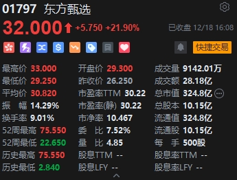 東方甄選大漲近22%。消息面上,12月18日下午消息,新東方教育科技 (集團(tuán)) 有限公司發(fā)布通知:任命董宇輝為新東方教育科技集團(tuán)董事長文化助理,兼任新東方文旅集團(tuán)副總裁。12月18日凌晨,東方甄選官方微博發(fā)布消息稱,俞敏洪和董宇輝18日20時將合體直播。據(jù)發(fā)布的宣傳海報顯示,俞敏洪為新東方創(chuàng)始人、東方甄選CEO;董宇輝成為東方甄選高級合伙人。
