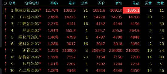午盤收盤,國內(nèi)期貨主力合約多數(shù)上漲,集運(yùn)指數(shù)(歐線)逼近漲停,漲幅12.76%,工業(yè)硅漲近3%,低硫燃料油(LU)漲超2%,SC原油漲近2%,棕櫚(7172, 10.00, 0.14%)油、液化石油氣(LPG)、燃油、滬錫(208400, 620.00, 0.30%)漲超1%。跌幅方面,生豬跌近3%,蘋果(8214, -79.00, -0.95%)、碳酸鋰、純堿跌超2%,白糖(0, -5064.00, -100.00%)、滬鎳(130900, -270.00, -0.21%)跌近2%。