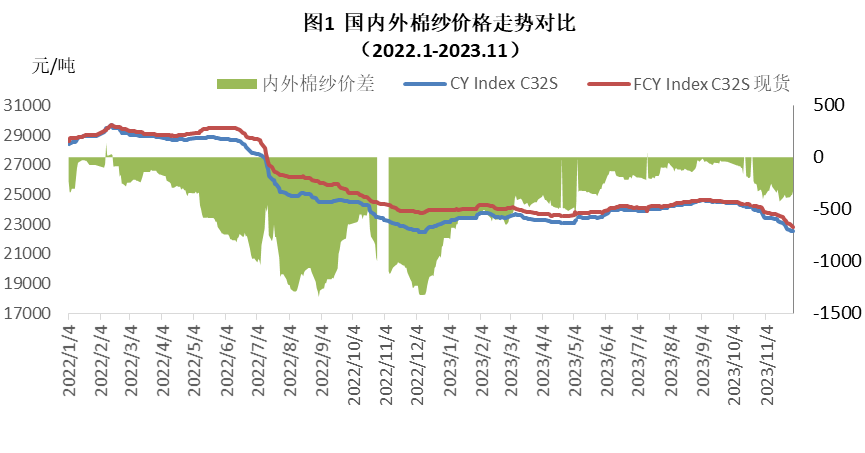 本月內(nèi)外棉紗價(jià)格均下跌,國(guó)產(chǎn)32支純棉紗11月均價(jià)為23104元/噸,較上月下跌了1018元,跌幅4.2%,較去年同期上漲了109元,漲幅0.5%;進(jìn)口32支純棉紗11月均價(jià)23256元/噸,較上月下跌了1056元,跌幅4.3%,較去年同期下跌了809元,跌幅3.4%。