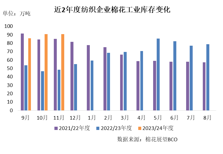紡織企業(yè)在成品庫(kù)存高企以及銷(xiāo)售虧損的情況下,經(jīng)營(yíng)壓力持續(xù)增加,原料采購(gòu)偏謹(jǐn)慎,隨用隨買(mǎi),月內(nèi)原料庫(kù)存基本維持前期水平。截至11月30日,紡織企業(yè)在庫(kù)棉花工業(yè)庫(kù)存量為90.7萬(wàn)噸,環(huán)比基本持平,同比高42.2萬(wàn)噸。其中:34%的企業(yè)減少棉花庫(kù)存,29%增加庫(kù)存,37%基本保持不變。