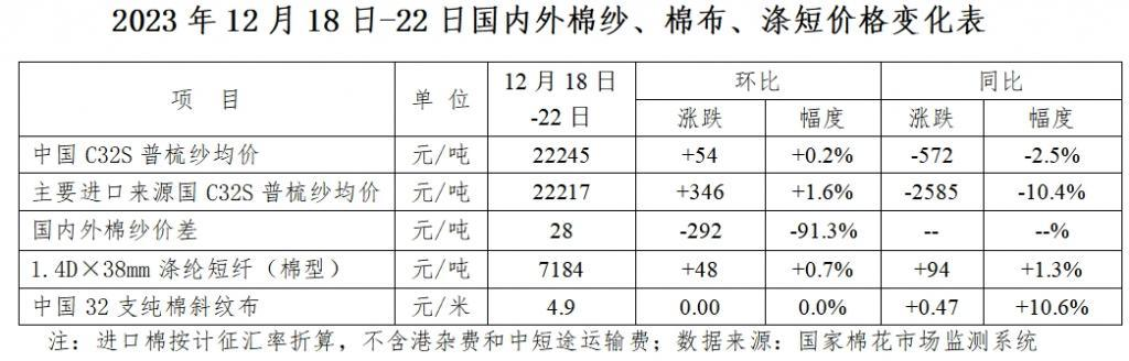 上周(2023年12月18日-22日),國(guó)內(nèi)棉花價(jià)格先跌后漲,國(guó)際棉花價(jià)格弱勢(shì)下行;國(guó)內(nèi)外棉紗價(jià)格上漲;國(guó)內(nèi)滌綸短纖價(jià)格上漲。
