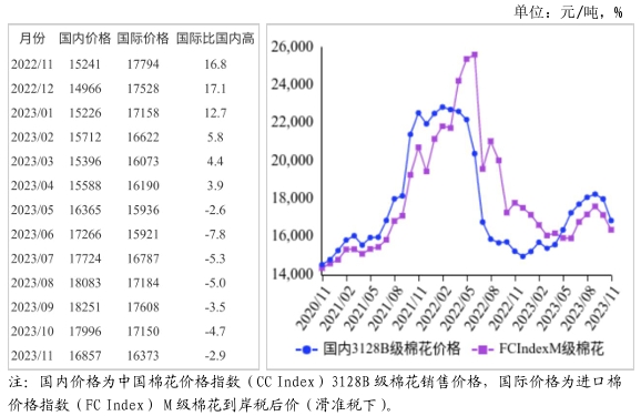 (一)國(guó)內(nèi)棉價(jià)持續(xù)下跌。本月,新棉采收已基本結(jié)束,新棉收購(gòu)進(jìn)入中后期,加之月初儲(chǔ)備棉延續(xù)足量投放,進(jìn)口棉到港量不斷增加,棉花供給階段性充裕;下游紡織市場(chǎng)旺季結(jié)束,企業(yè)新訂單量持續(xù)減少,需求相對(duì)疲軟。棉花價(jià)格持續(xù)下跌,銷售進(jìn)度較往年偏慢。據(jù)國(guó)家棉花市場(chǎng)監(jiān)測(cè)系統(tǒng)數(shù)據(jù),截至11月23日,全國(guó)新棉采摘進(jìn)度98.8%,同比增長(zhǎng)0.5個(gè)百分點(diǎn);全國(guó)籽棉交售率93.4%,同比下降1.5個(gè)百分點(diǎn);全國(guó)皮棉銷售率為4.3%,同比下降1.6個(gè)百分點(diǎn),較過(guò)去四年均值下降9.2個(gè)百分點(diǎn)。采購(gòu)意向調(diào)查顯示,11月初準(zhǔn)備采購(gòu)棉花的企業(yè)占47.1%,環(huán)比增9.0個(gè)百分點(diǎn),同比減13.2個(gè)百分點(diǎn),比近五年同期平均水平減少17.6個(gè)百分點(diǎn)。11月份,國(guó)內(nèi)3128B級(jí)棉花月均價(jià)每噸16857元,環(huán)比跌6.3%,同比漲10.6%。鄭棉期貨主力合約(CF401)月結(jié)算價(jià)每噸14950元,環(huán)比跌7.1%,同比漲13.1%。